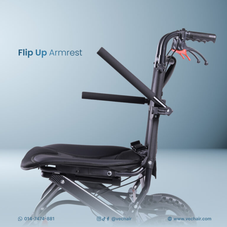 Flip up arm rest for user to easily transfer from bed or car seat.